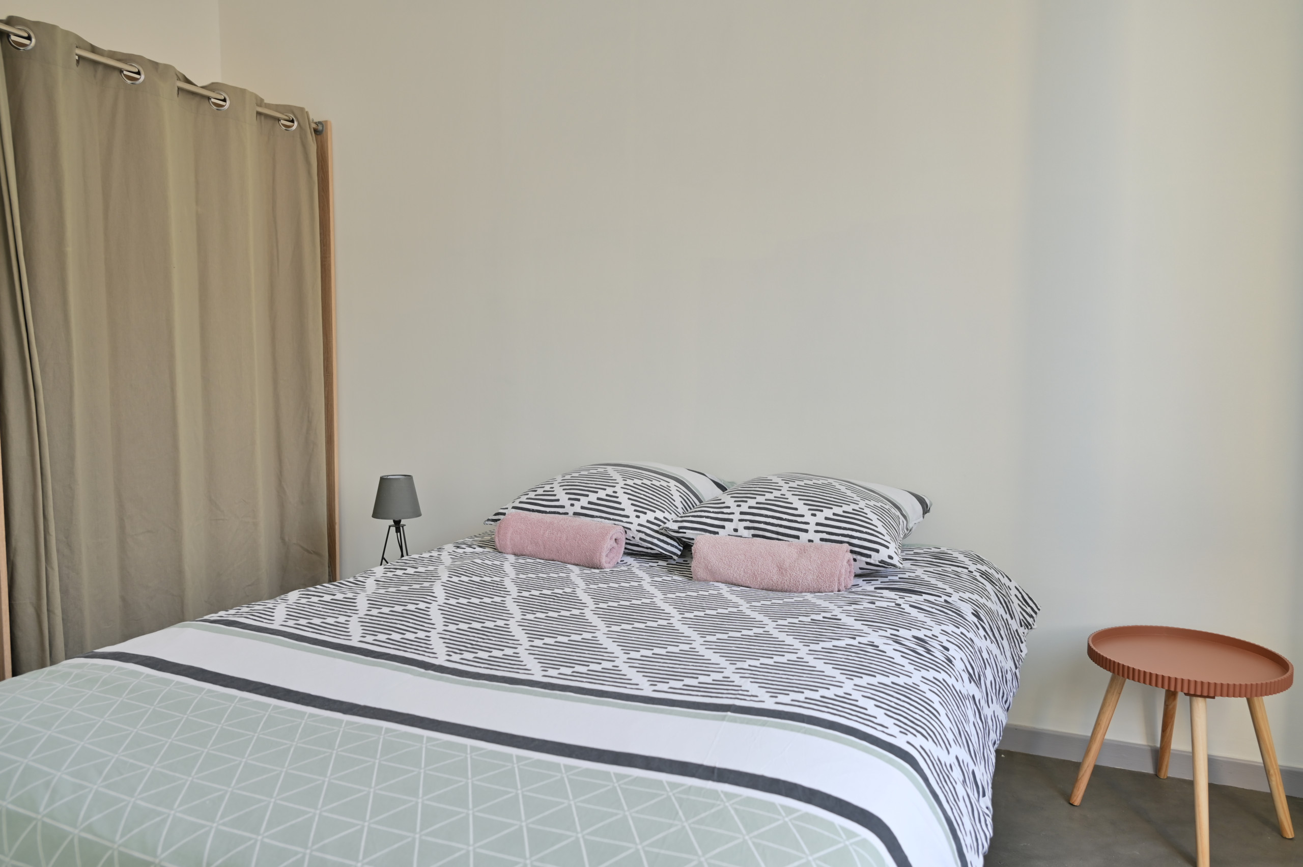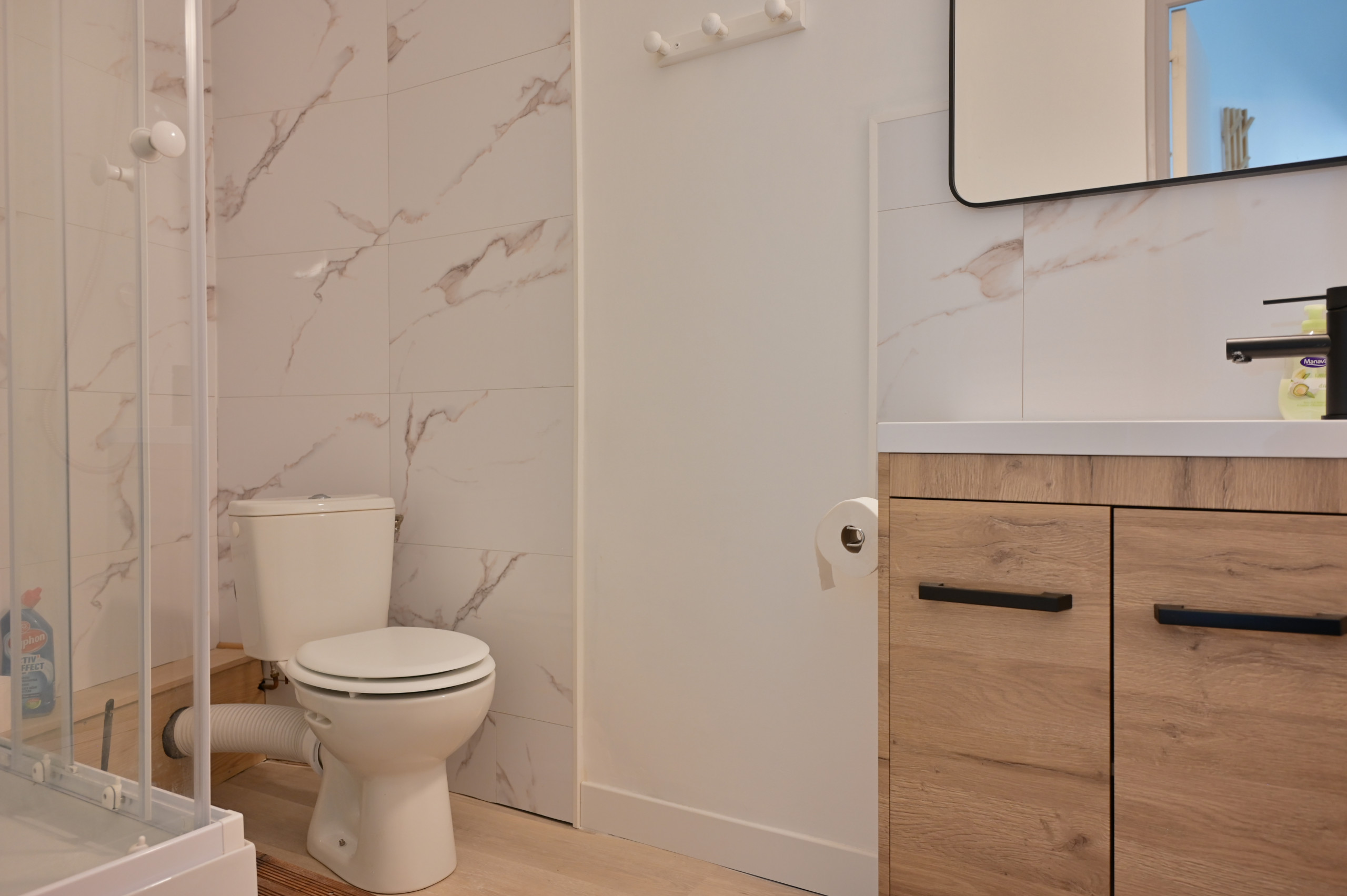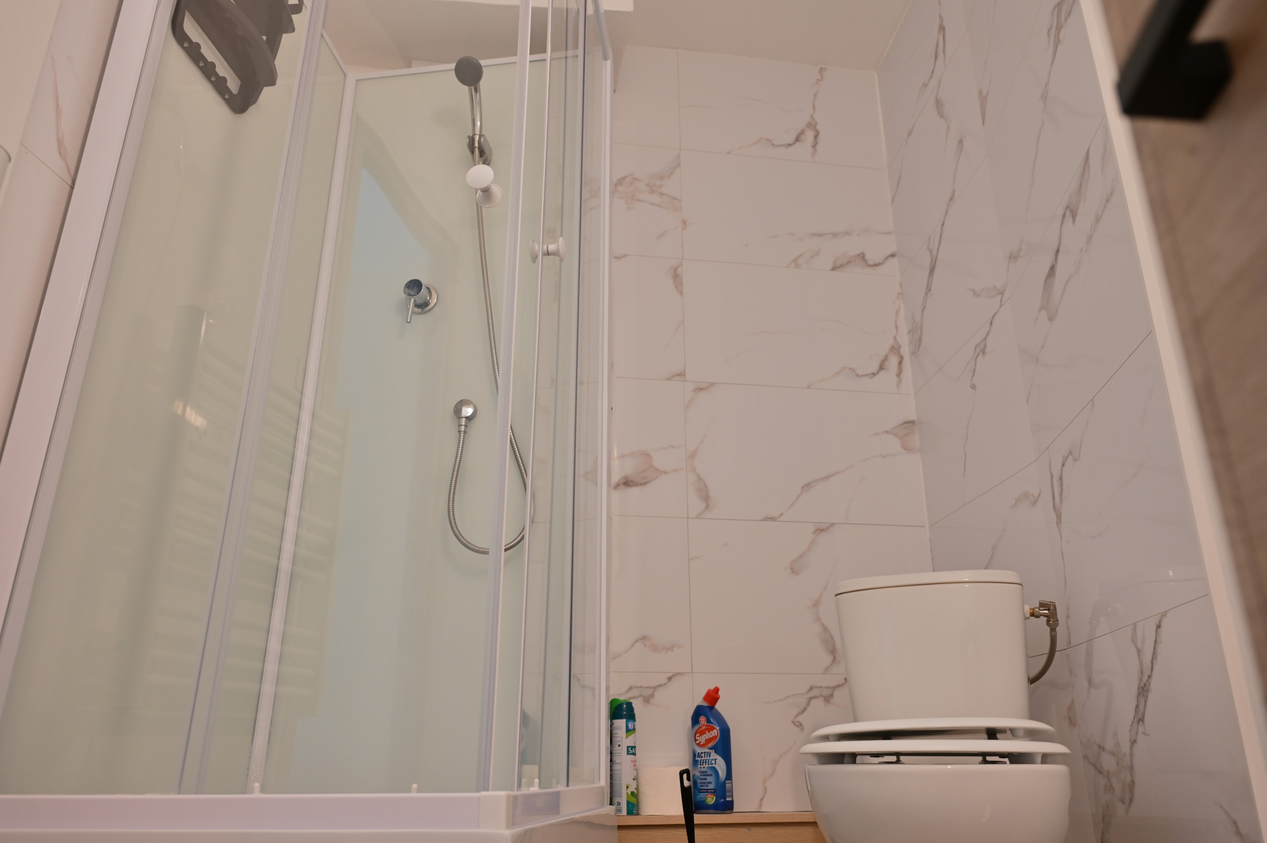 The bathroom with a shower and a toilet offers all the necessary comfort. Electric heating and essential products provided ensure a pleasant stay. The apartment is also equipped with an iron, hangers and a washing machine, designed for medium-term professional stays.