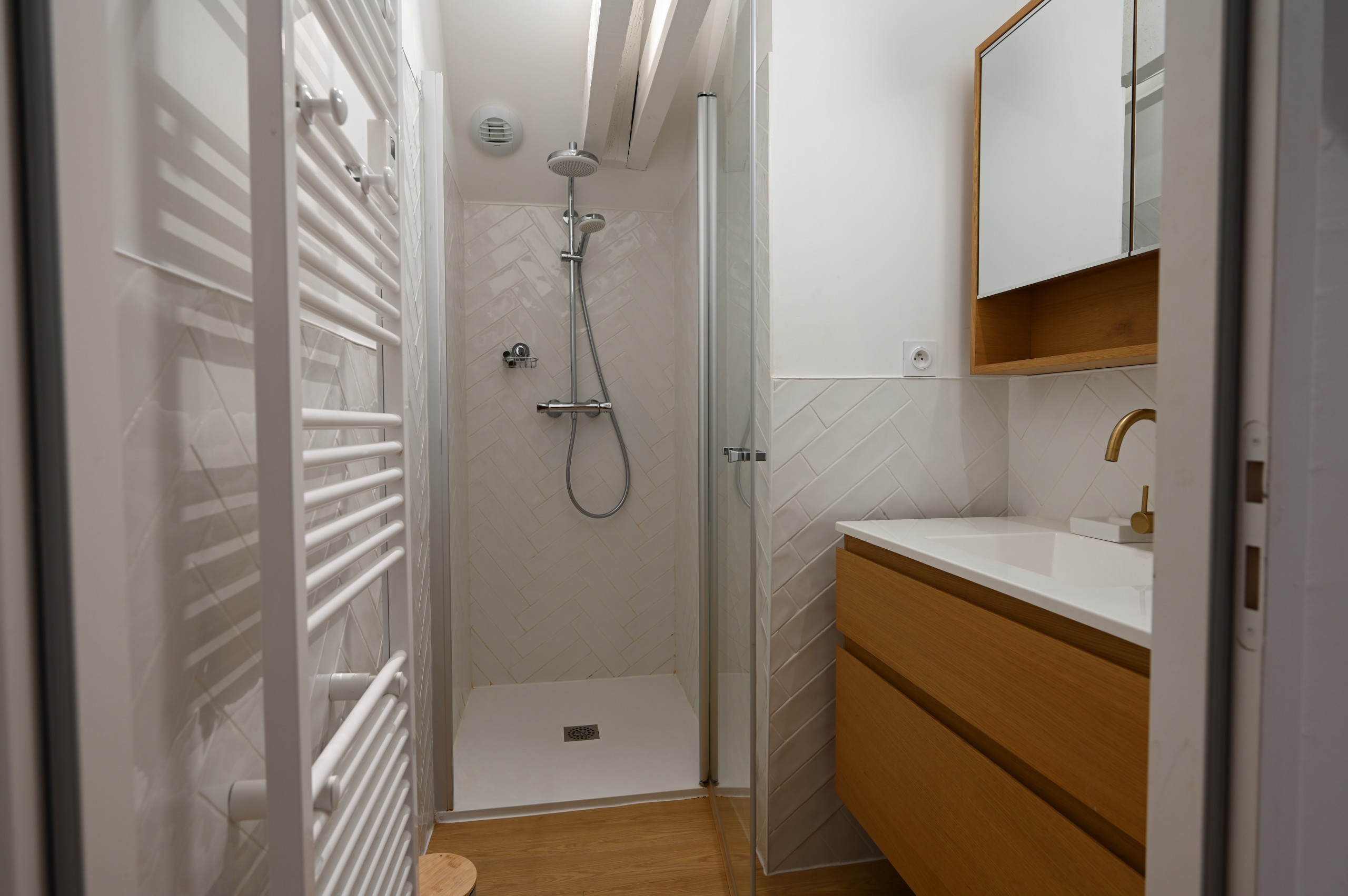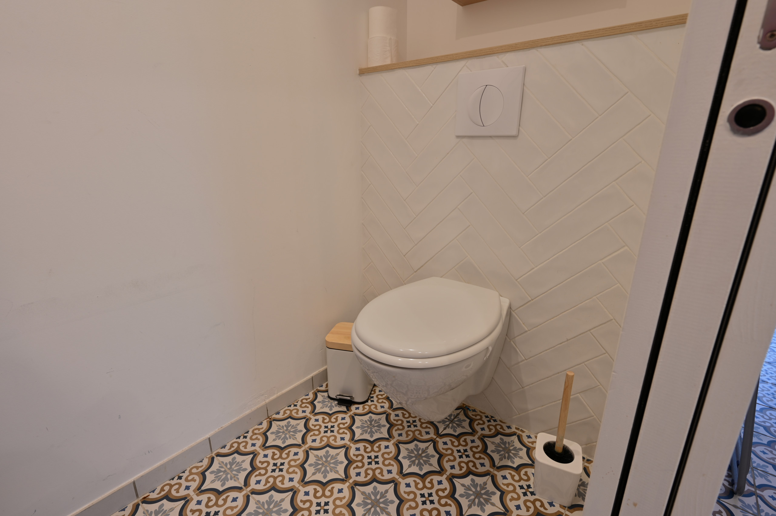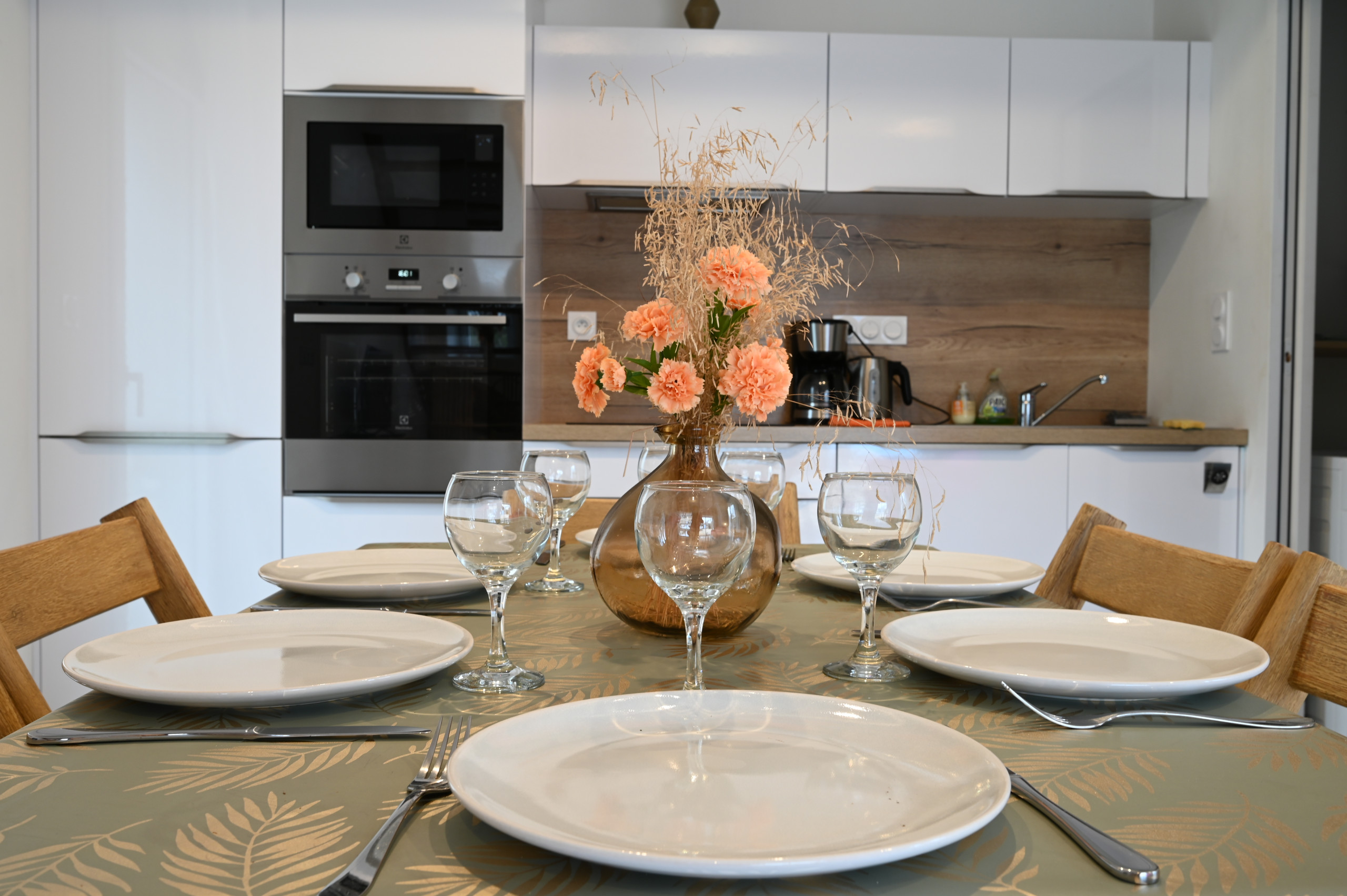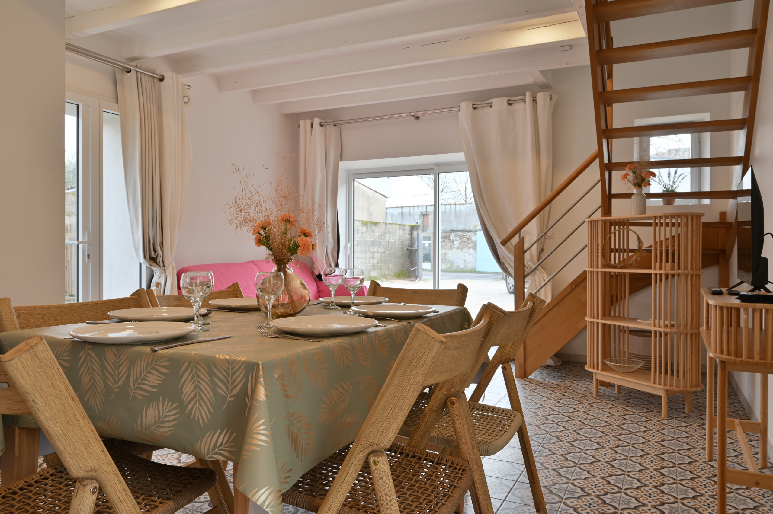This bright little house will delight families and business teams alike. It can accommodate up to 4 guests in its two bedrooms, both equipped with comfortable mattresses: one with a large double bed (160x200) and the other with two single beds. The bathroom has a walk-in shower and a vanity unit. Bed linen and towels are provided. The toilet is separate.