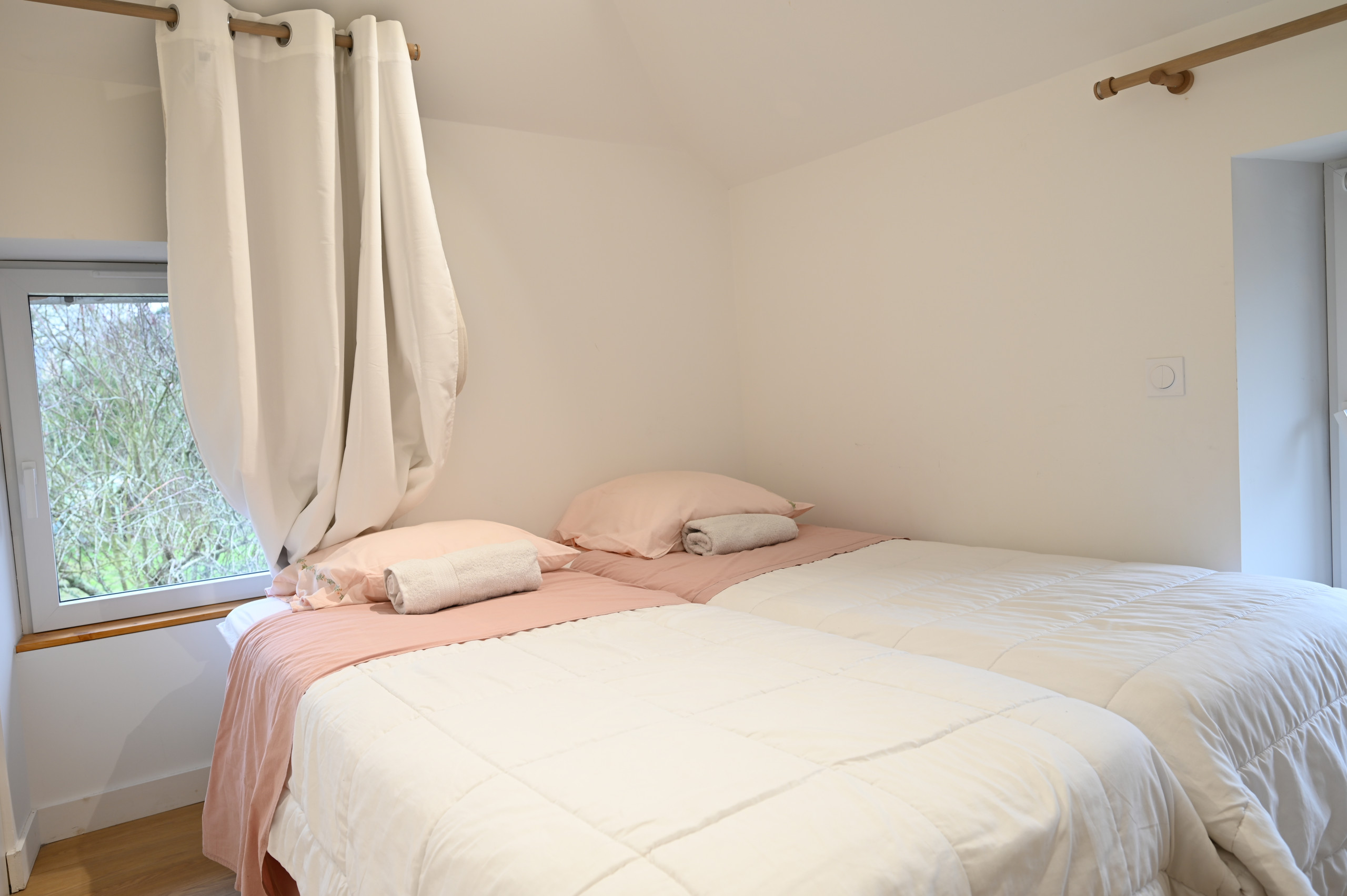 Cette lumineuse petite maison ravira les familles comme les équipes de travail en déplacement. Elle pourra recevoir jusqu'à 4 voyageurs dans ses 2 chambres toutes deux équipées de matelas grand confort, l’une avec un grand lit double (160x200) et la seconde avec 2 lits simples. La salle d’eau dispose d'une douche à l’italienne et d'un meuble vasque. Linge de lit et de toilette fournis. Les toilettes sont séparées.