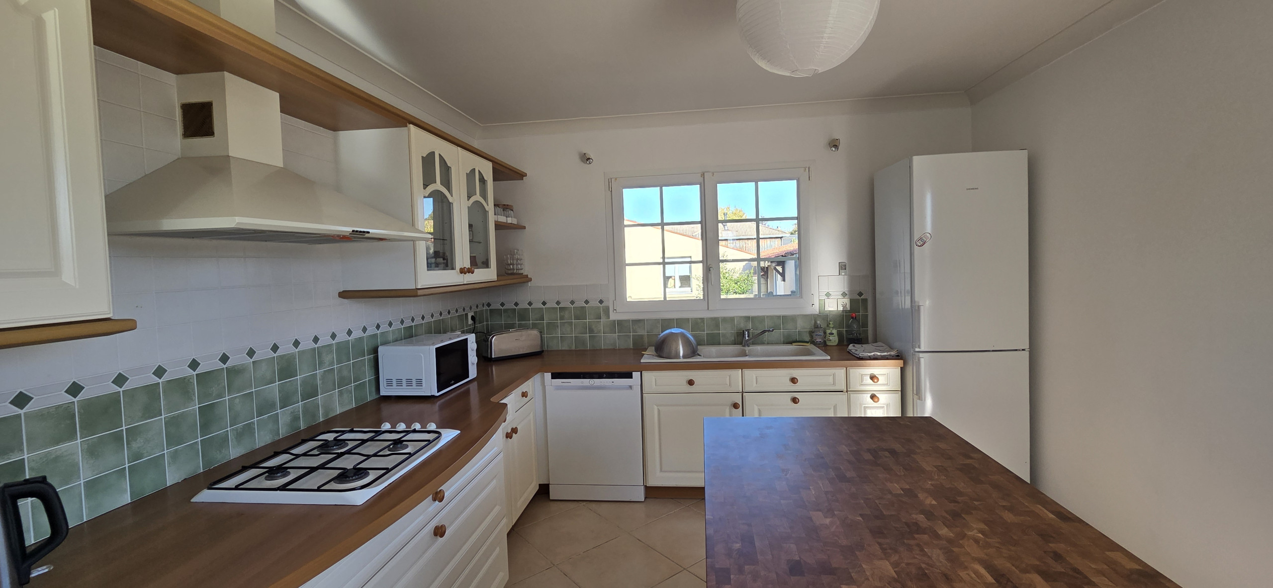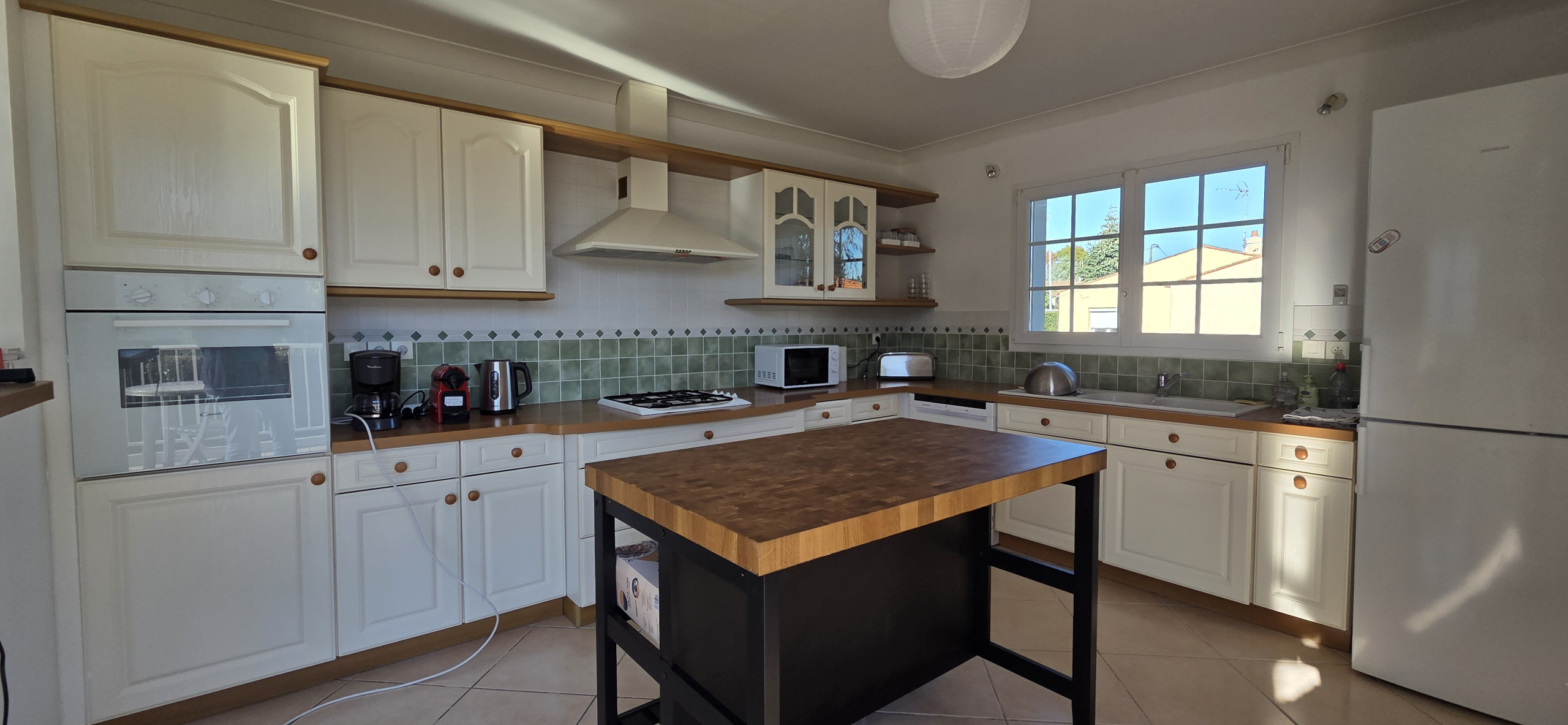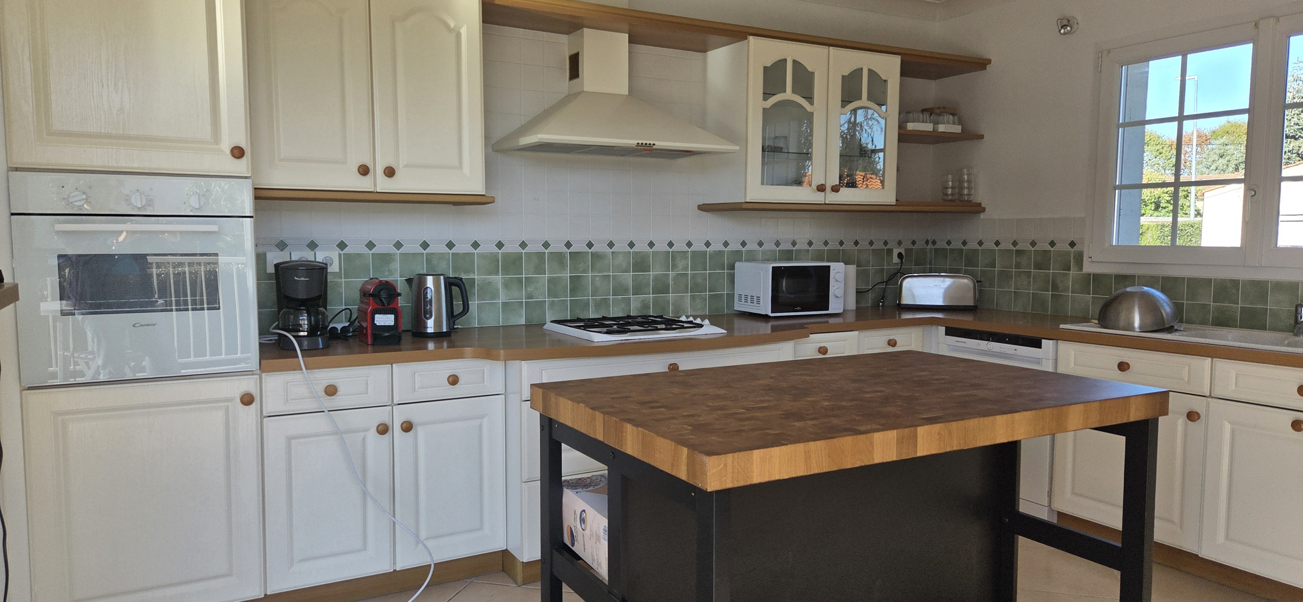 La cuisine américaine, à induction, est équipée avec réfrigérateur, micro-ondes, four, congélateur, lave-vaisselle, vaisselle/couverts, ustensiles/cuisine, cafetière, grille pain et bouilloire.